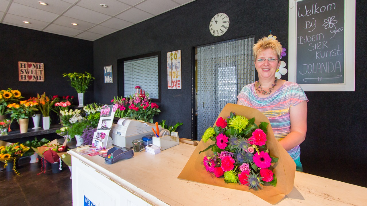 ”Het idee om een eigen bloemenzaak te beginnen is ontstaan toen ik voor mijn opleiding in Velp een examenstuk moest maken: ‘Mijn eigen bloemenzaak’. Vanaf mei 1990 heb ik de toen leegstaande winkel gehuurd van de familie Seesing” vertelt Jolanda. ”Nadat we de winkel opgeknapt hadden zijn we op 16 augustus 1990 geopend als een bloemenzaak met bloemen, planten en cadeauartikelen. De planten inkoop doe ik elke week met mijn man John bij Plantion te Ede en de snijbloemen komen van de grossier.”