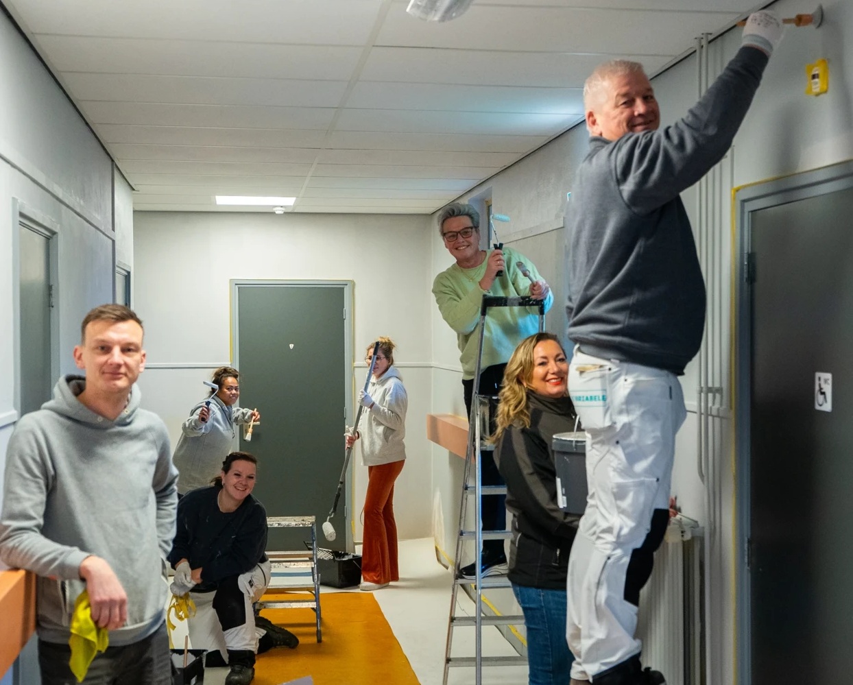 De voormalige Heideschool in Halle-Heide is sinds 2016 een buurthuis, genaamd Het Heidehuus. Een plek voor bewoners jong en oud, om samen te zijn. Samen feest vieren, vergaderen, eten, workshops en voorstellingen volgen, naar muziek luisteren en spelletjes doen. Deze editie van De Variabele Doet! kwam er een groep medewerkers vrijdag 7 februari om de gangen een opfrisbeurt te geven. Muren, deuren en kozijnen werden aangepakt en aan het einde van de dag ging iedereen met een tevreden gevoel naar huis.