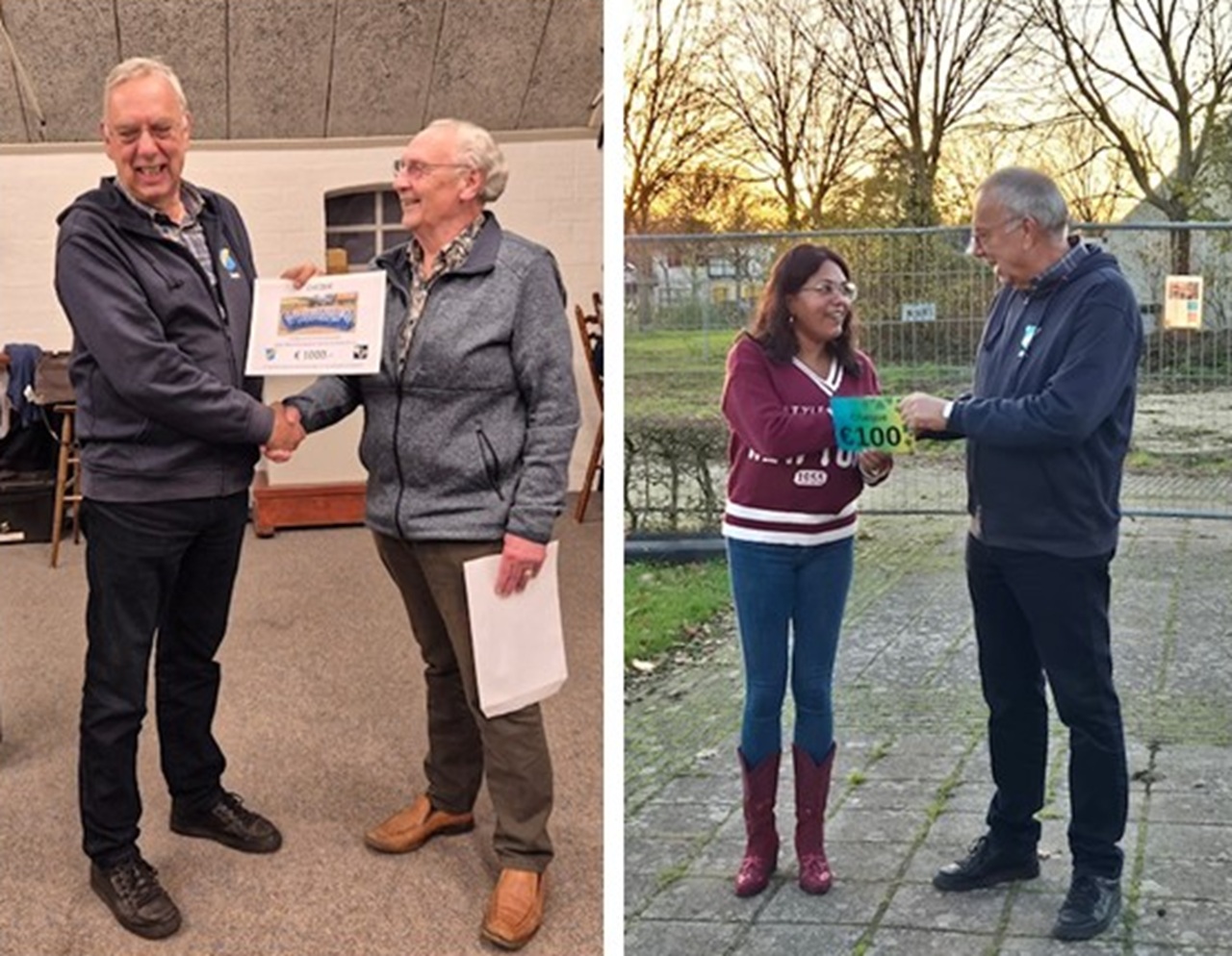 Voorzitter Jan Slagt kreeg begin deze week maar liefst twee donaties ten bate van de Lochemse tafeltennisvereniging De Toekomst. Niet toevalligerwijze ging het om twee buren van de vereniging die in januari haar hal aan de Runmolenlaan door een verwoestende brand verloor. De gulle gevers zijn de organisatrice van het nieuwe Boeken Event en de leden van het jubilerend Lochems Mannenkoor. De cheques van respectievelijk 100 en 1000 euro krijgen allebei een mooi plekje tussen vele anderen aan de muur in de Nettelhorsterschool waar De Toekomst tijdelijk onderdak heeft gevonden.