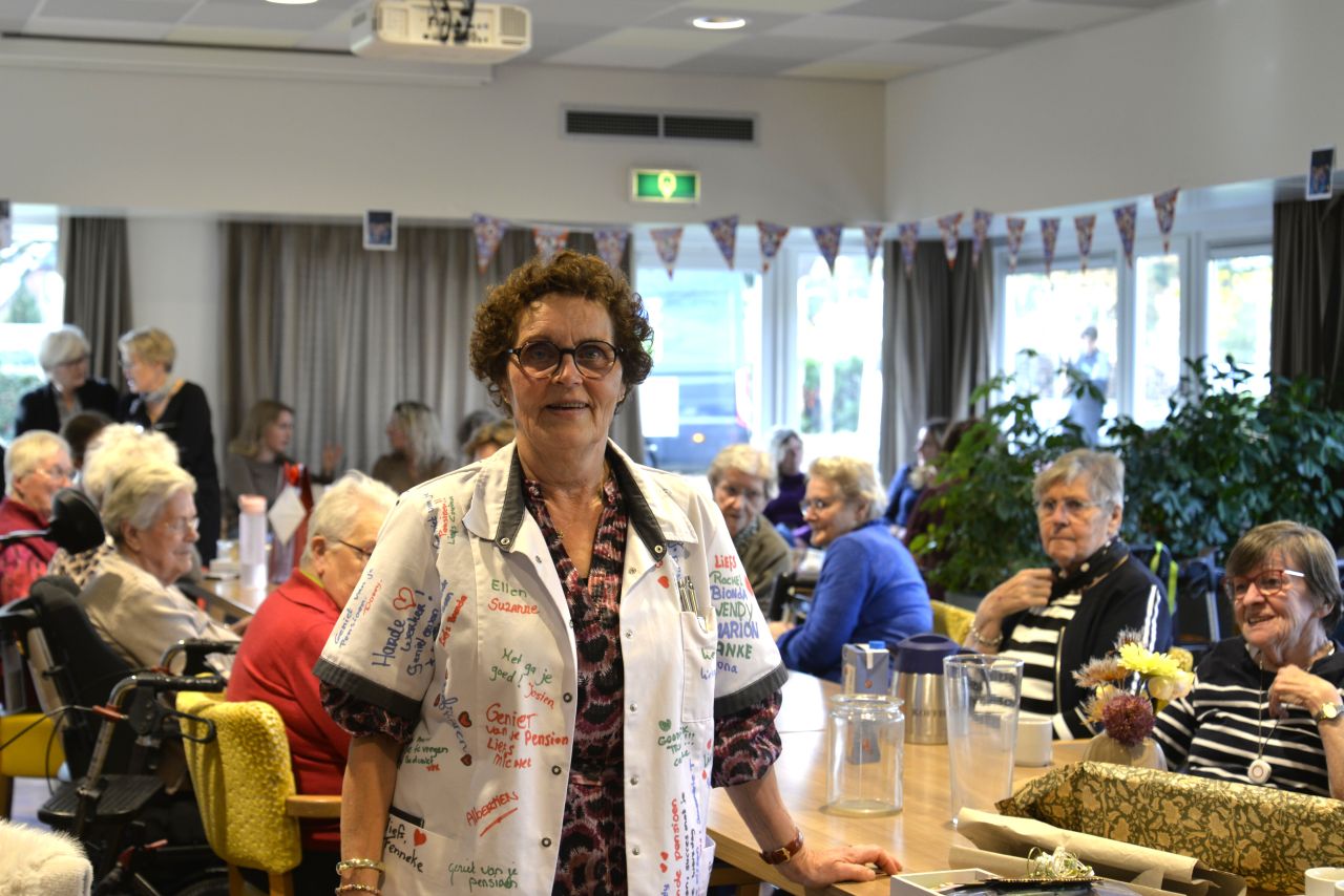 De schort, die ze op haar laatste werkdag aan heeft gehad en die beschreven was door haar collega’s, had ze voor de gelegenheid nog een keer aangedaan. Zo werd deze speciale dag flink luister bijgezet. Nu kan ze samen met haar man gaan genieten van een welverdiend pensioen, nadat ze haar hele leven in de zorg heeft gewerkt.